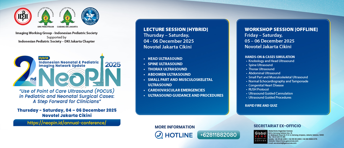 As the driving force of Imaging Working Group – as the complementary body of the Indonesian Pediatric Society, the Neonatal and Pediatric Imaging Network (NeoPIN) is a community to encompasses and bring together doctors from various sub-specialties, particularly in pediatrics, who are interested in studying the use of ultrasound equipment for providing healthcare services to the wider community, including Pediatric Intensivist; Pediatric Respirology; Pediatric Hematology; Pediatric Infectious Diseases; Pediatric Neurology; Pediatric Nutrition & Metabolism; Pediatric Gastroenterology; Pediatric Immunology; Pediatric Cardiology ; Pediatric Surgery ; Pediatric Anesthesiologists and General Practitioners.
