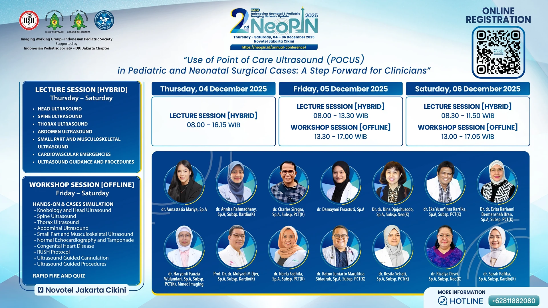 The Hybrid 2nd Indonesian Neonatal and Pediatric Imaging Network (NeoPIN 2025), taking place on December 4–6, 2025 at Novotel Jakarta Cikini and streamed online at https://neopin.id, focuses on the growing role of Point of Care Ultrasound (POCUS) in pediatric and neonatal care.